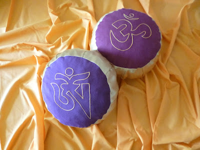 Espectaculares almohadones (zafus) en gabardina, con OM bordado. Aromatizados con aceite esencial de Sándalo para beneficiar al practicante.
