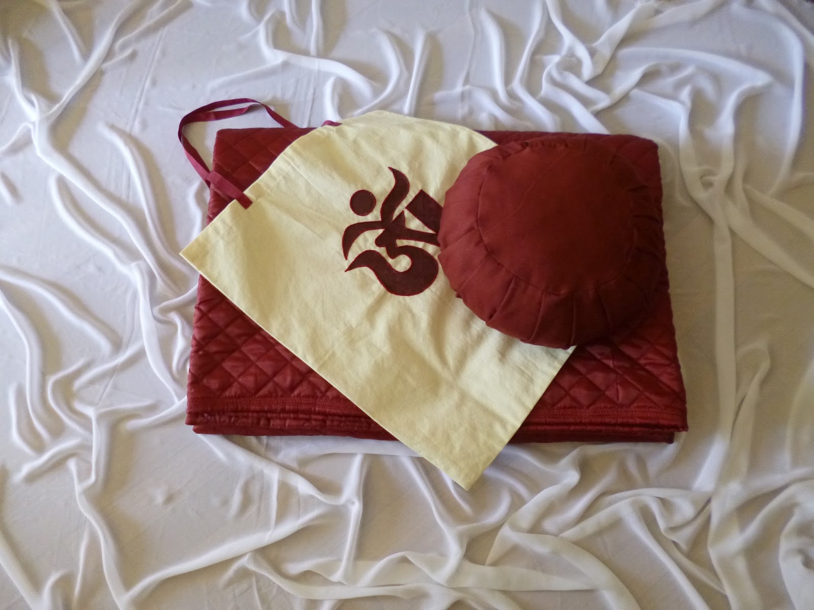 Cálido y práctico set de meditación (shine). Compuesto por manta (zafutón) confeccionado en matelasse de cuatro capas y almohadón (zafu) en gabardina.
